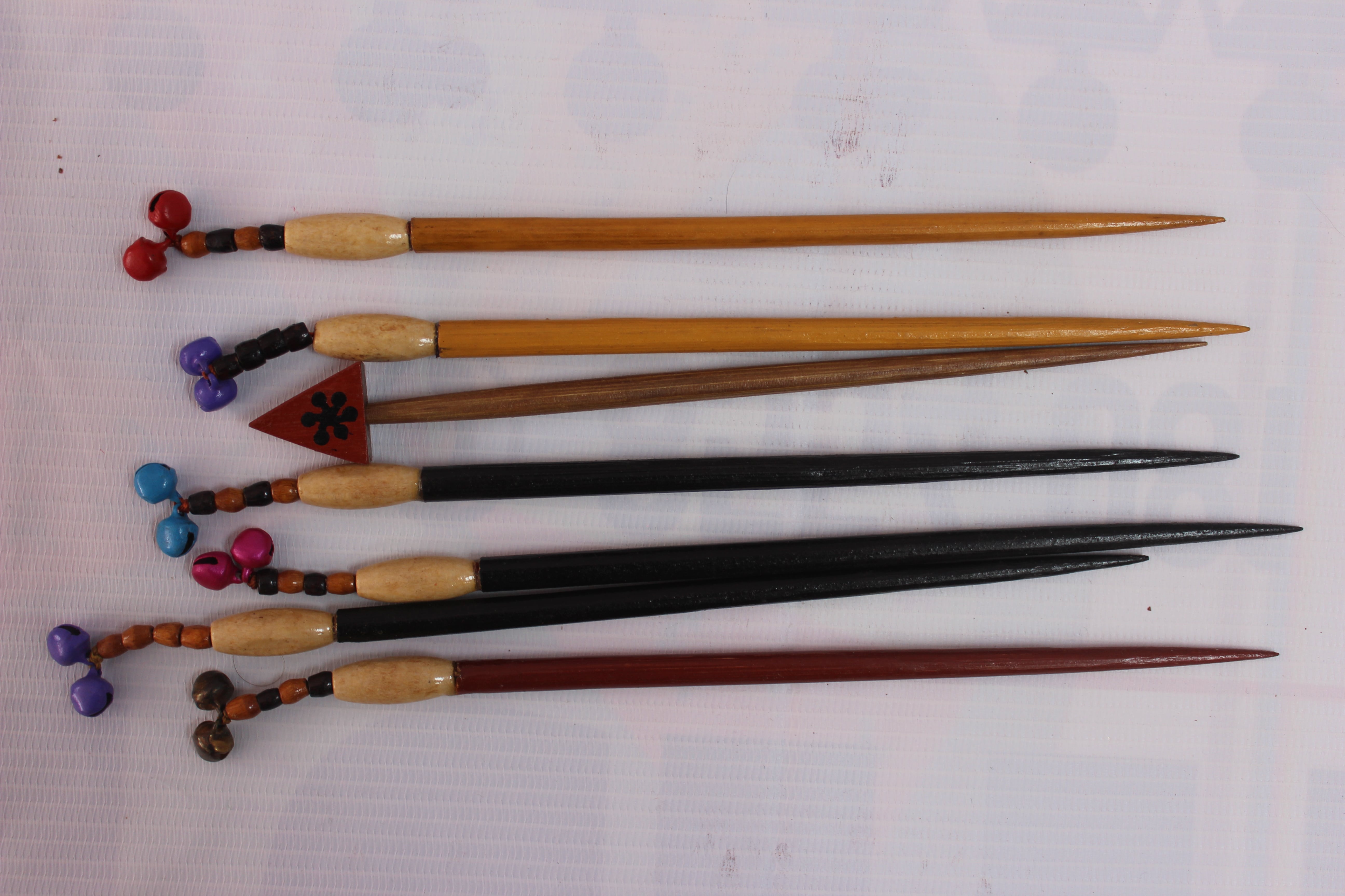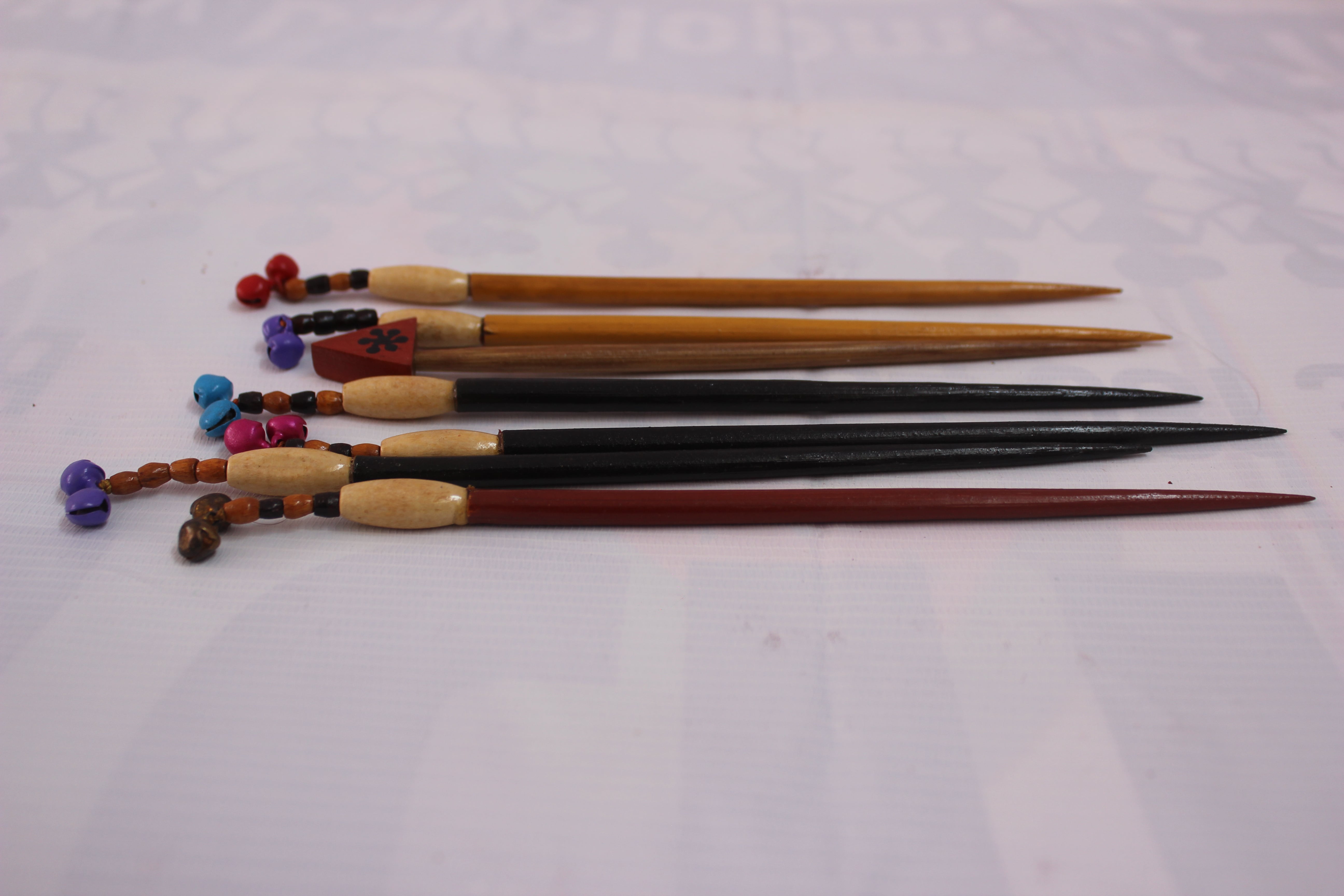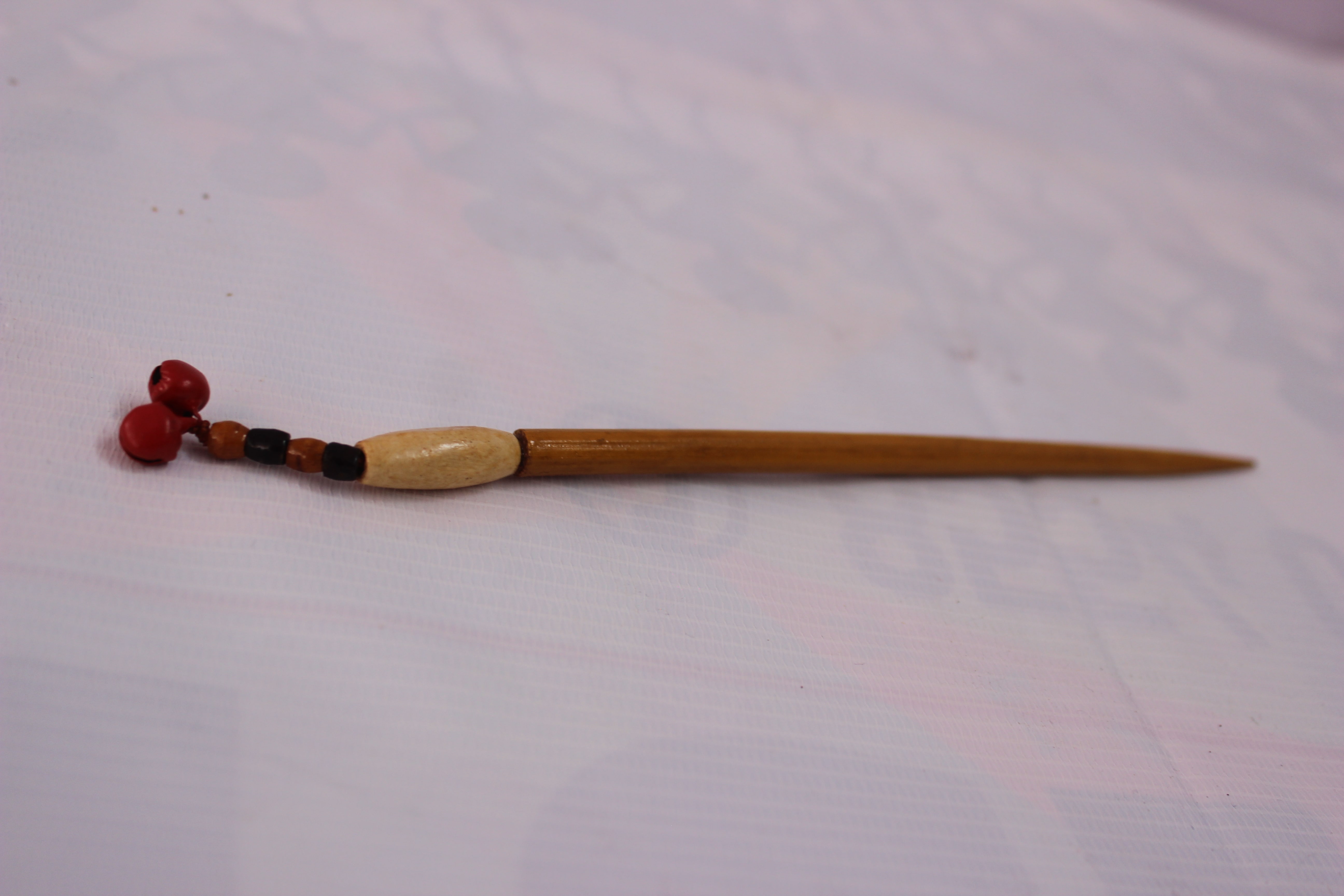 A hair barrette made from organic materials and carved from a coconut tree.